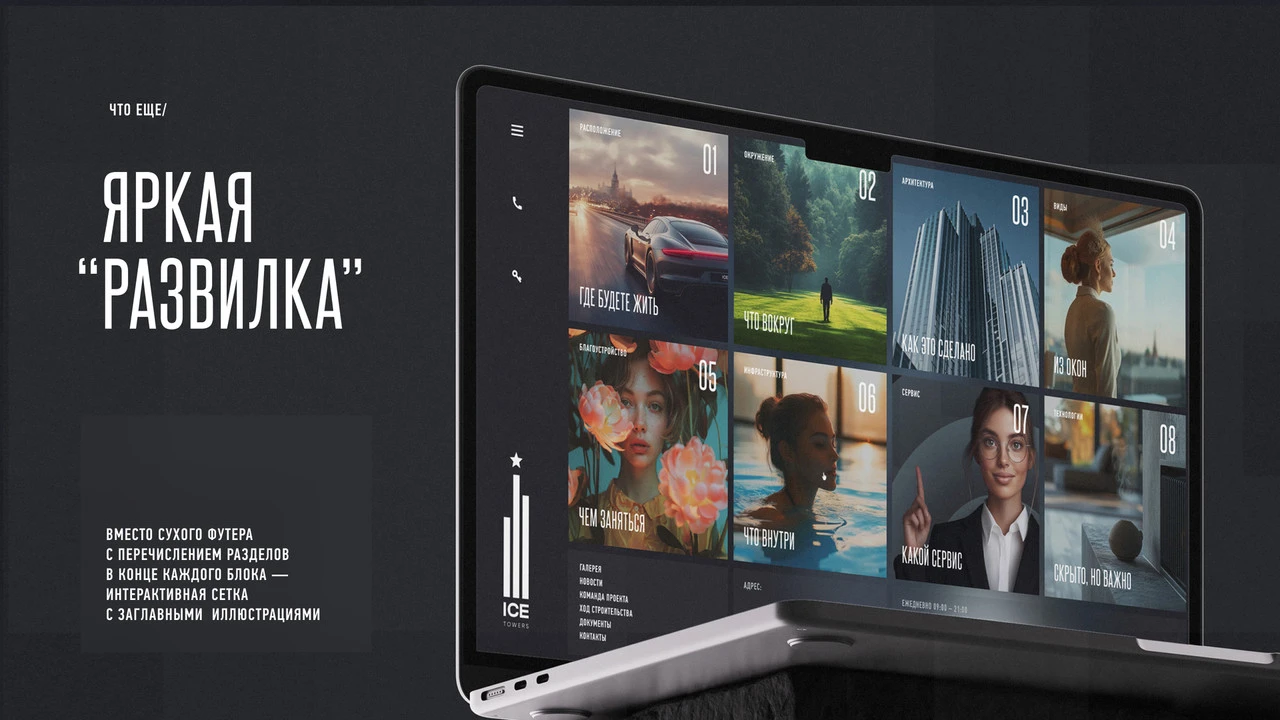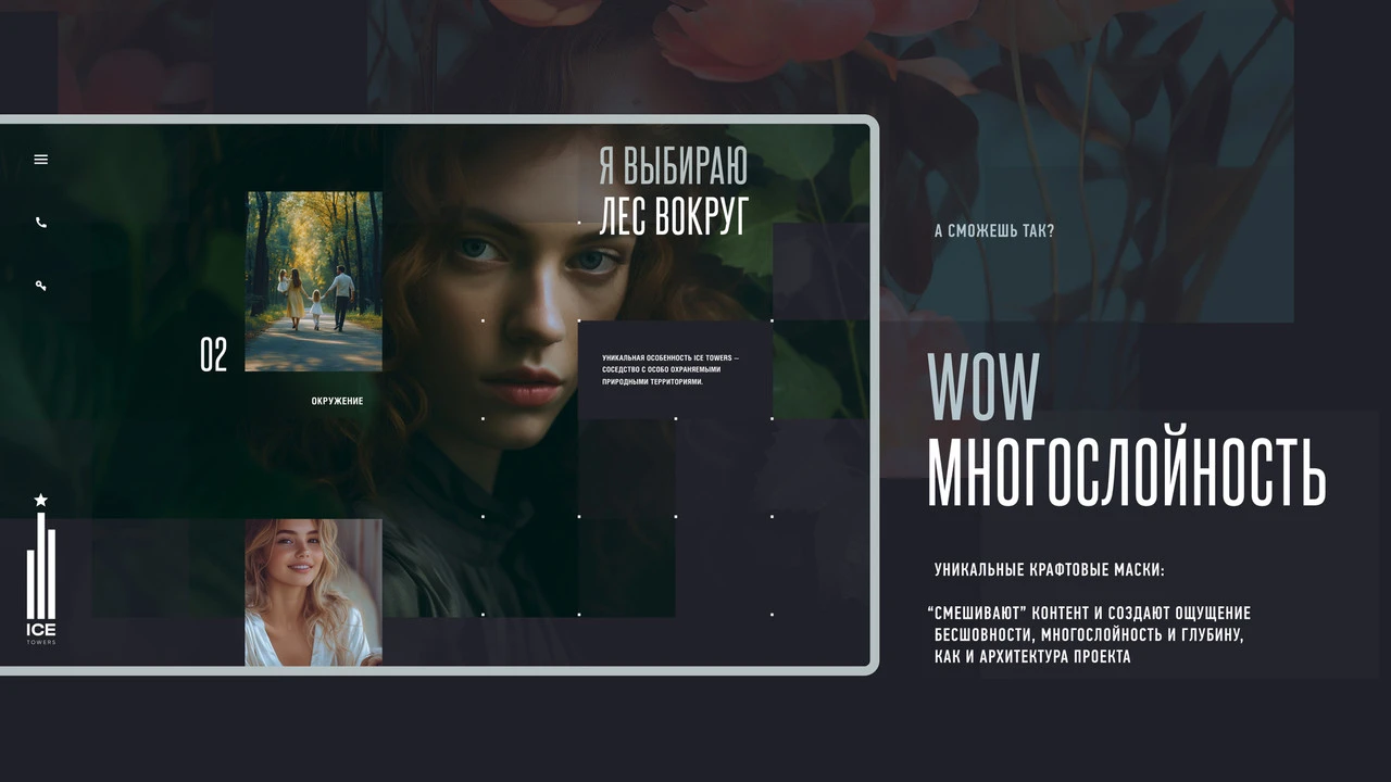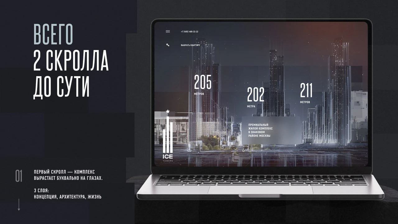 Решая основные задачи (рассказать о проекте, раскрыть преимущества и стимулировать продажи), в творческом порыве мы создали больше чем рабочий инструмент. Сайт Ice Towers получился произведением современного искусства. Он обладает яркой образностью при безупречном построении. Сайт с нуля, наполненный динамичной графикой и 3D-анимацией, которые передают эмоцию Ice Towers.
