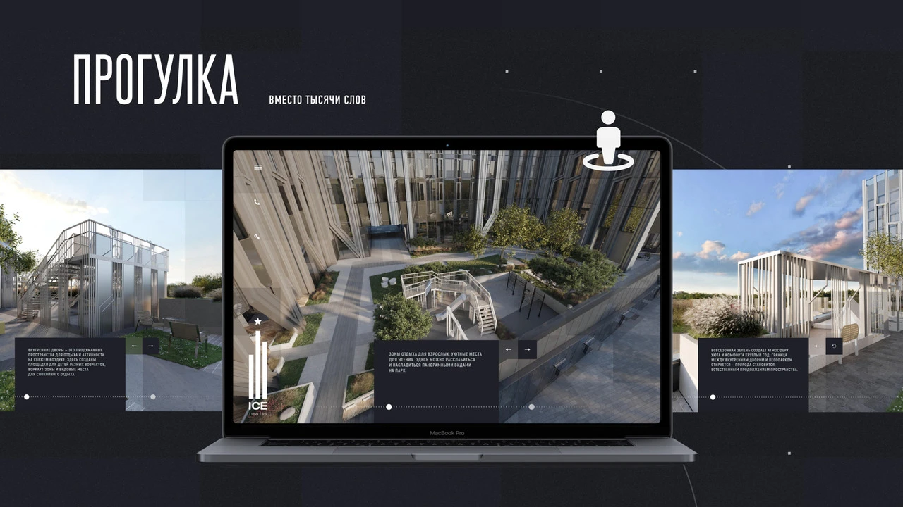 Привычные статичные визуализации в благоустройстве дополняем виртуальной прогулкой и генпланом с локациями, с помощью которых показываем все великолепие внутреннего двора.