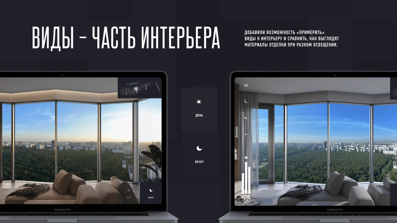 Выверенный модуль выбора квартиры: доступен подбор на генплане и поиск по фильтрам, ориентация по сторонам света, виды из окон в дневное и вечернее время, сохранение в избранное, отправка pdf и синхронизация с CRM-системой.